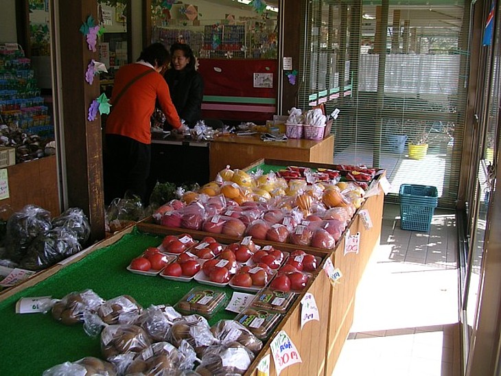 左隅の野菜・果物直売所。夏から秋の果物は豊富だが野菜類は少なく値段も高めで魅力に欠ける。