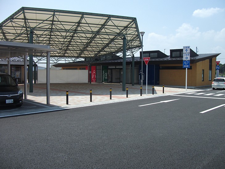 メイン駅舎の右側に24時間営業のサンクス、その右側に屋根付きのイベントスペース、右側は24時間トイレ。