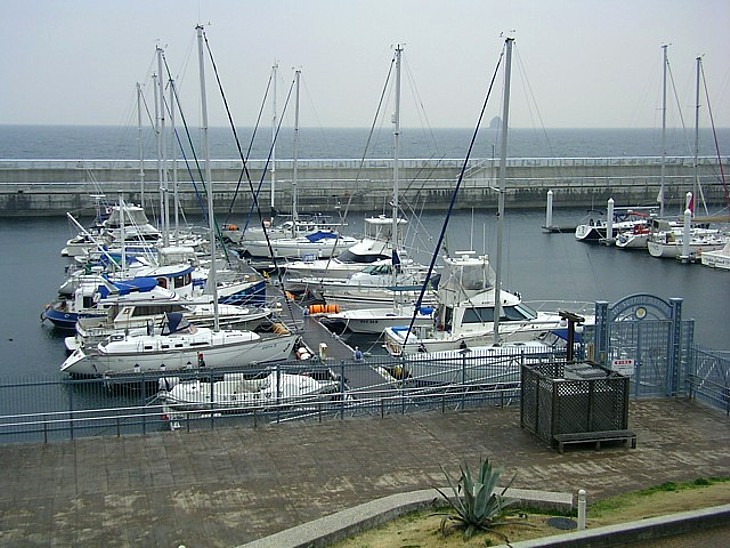 2階テラスからはマリーナ全体が見下ろせる。微かに見えるのは伊東港沖の手石島。