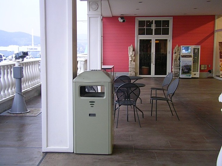 展望テラスにはテーブルセットとコイン式双眼鏡が設置されている。すぐ隣はインドネシア料理店。