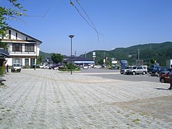 トイレ棟前の広い石畳には東屋やベンチ、暖かな季節ならのんびり休憩も可能。国道沿いにはローソンが建つ。