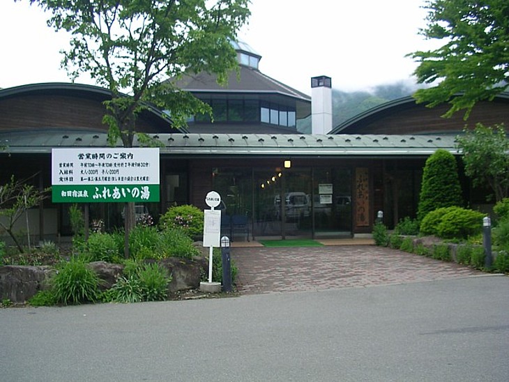 「ふれあいの湯」の入口。駐車場は数ヶ所にあり、大型車も停められるため仮眠に利用するトラックも多い。