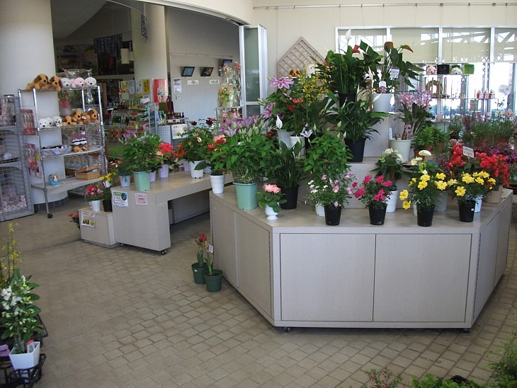 一階の隅にある園芸花鉢の売り場。量は余り多くないが、花の香りに誘われて屋外のバラ園へ足を伸ばす。