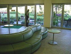 トイレ横に24時間使える休憩室、円形のメイン駅舎一階にはソファを備えたリラックスできるコーナー(夜間は閉鎖)がある。
