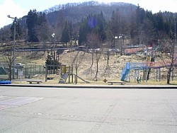 多目的ホールの裏手に遊具を備えた緑地の斜面がある。 | |