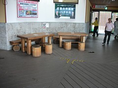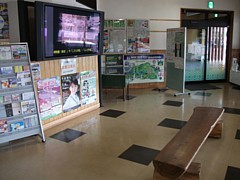 情報交流コーナーと展示休憩室の2区画があり、どちらも9〜19時の間利用できる。どちらもスペースはかなり広くてテーブル類や案内機材も整えられている。家族が持ち込みの食事でのんびり休憩する程度は充分に可能。 | |