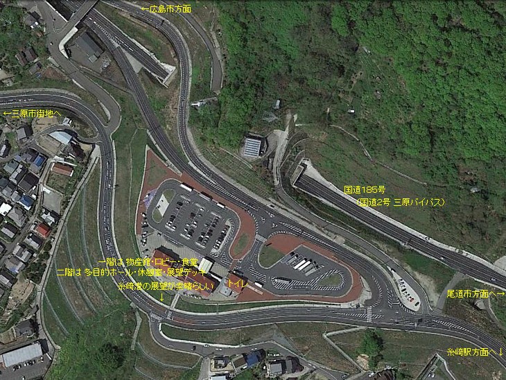 山の中腹を通る2号バイパス沿い、展望の素晴らしい道の駅。瀬戸内の鮮魚も扱っているのは嬉しい。