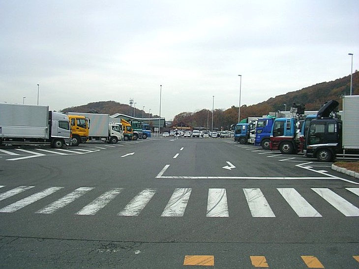 バイパスから見て右側の大型車駐車場。約40台を収容するが満車で入れないケースもある。