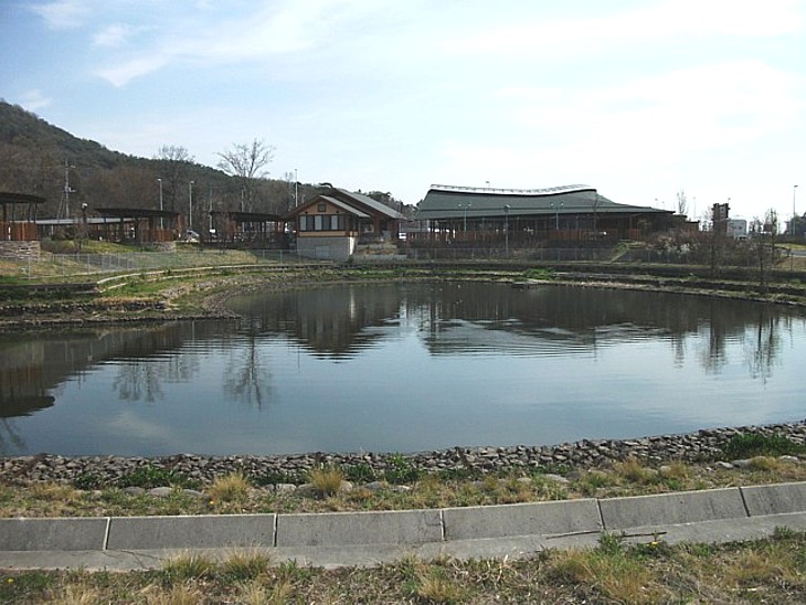 調整池の対岸から駅舎を撮影。左側の休憩室と正面に食事処のテラス、右側は50号バイパス。