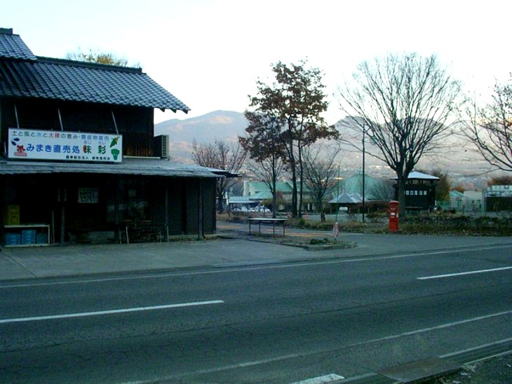駐車場前から駅舎方向を。道路に面して軽食を兼ねた物販棟。