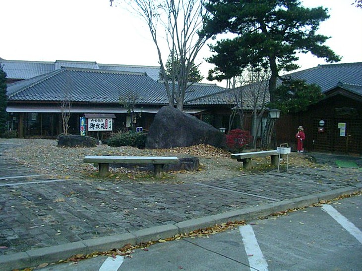 メイン棟の裏、左側が食事処(悪くない)の入口。