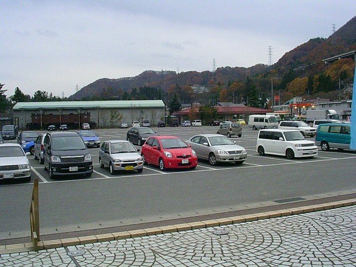 駅舎から駐車場を撮影。右の山の中腹には関越道が走る。