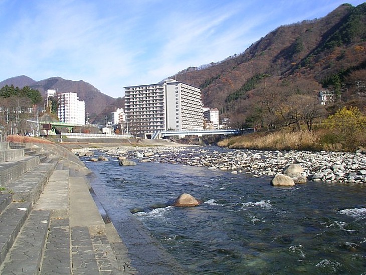 親水公園から、上流の温泉街に続くホテル群が見える。芝生も広く、ピクニックできる雰囲気も楽しい。