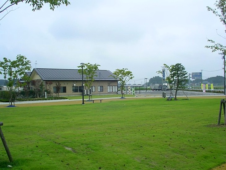 宮城県の道の駅「みなみかた」 グラウンド側から芝生越しに見た駅舎、向こう側が駐車スペース。