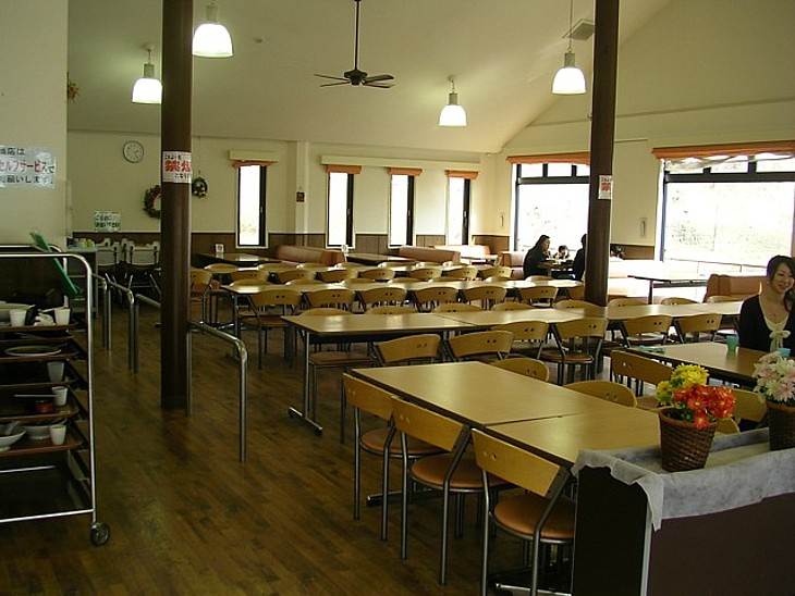 セルフの店内は座席数も多いが麺類中心でメニューは少ない。テーブルの配置は学食風だ。