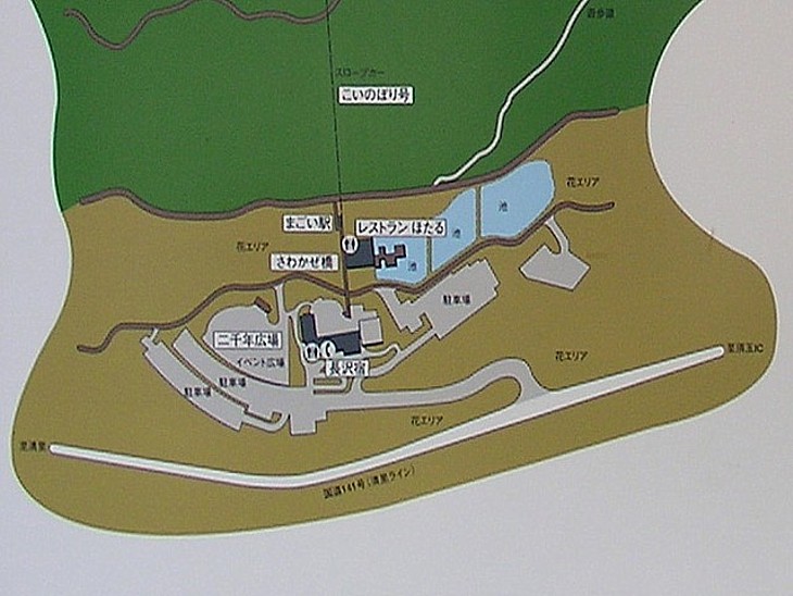 道の駅の配置図。レイアウトは複雑で、数ヶ所の駐車場やドッグラン・池や食事棟などが造られている。