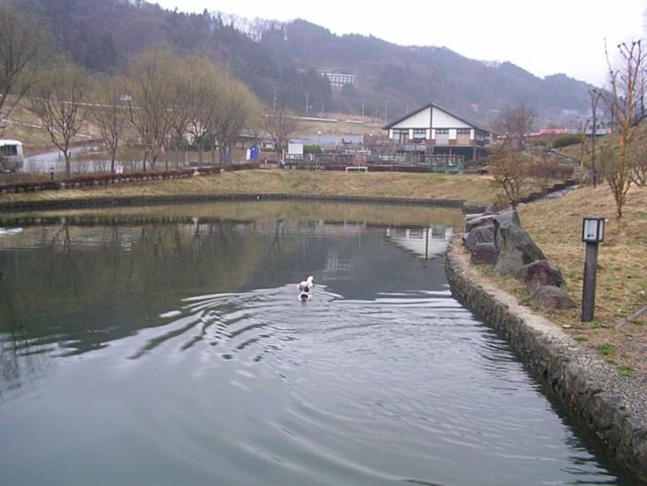釣り堀池の反対側から駅舎の方向を。池にはアヒルが泳ぎ、周囲には遊歩道が整備されている。
