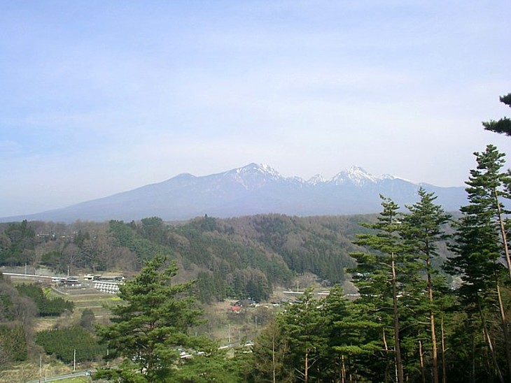 北西方向に聳える八ヶ岳の景観。山裾の手前を左へ進むと甲斐武田の祖・清光の谷戸城〜小淵沢に至る。