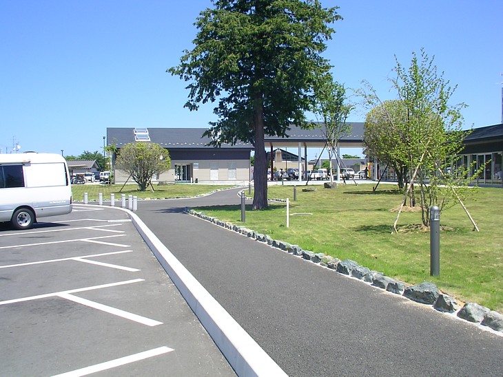大型車の駐車場と芝生の間には歩道が続く。右は食事棟、正面にトイレ棟とイベントプラザの屋根が見える。