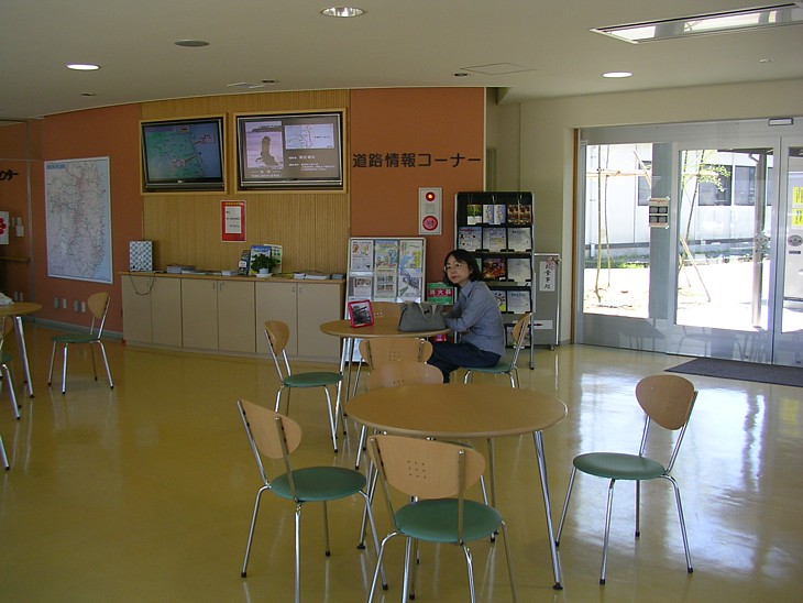 休憩室は窓が大きく、情報用設備も整っている。休日には係員が地域のPR活動を展開している。