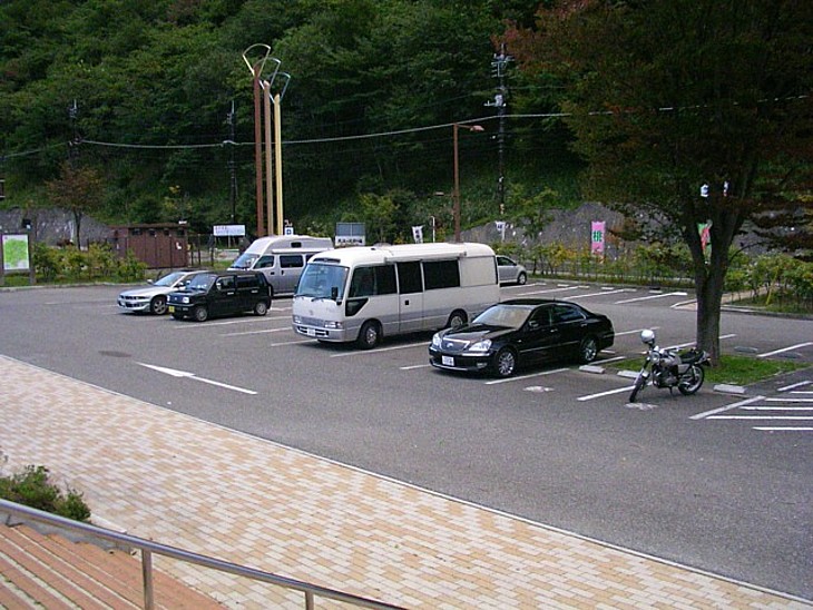 駅舎前は普通車用、大型車や観光バスは左側に分離される。右画像は北側のサブ駐車場。