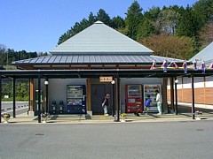 国道の交差点だが交通量は少ない。道路沿いが開放的な駐車場で、大型スペースから離れた駅舎左奥が落ち着ける。 |