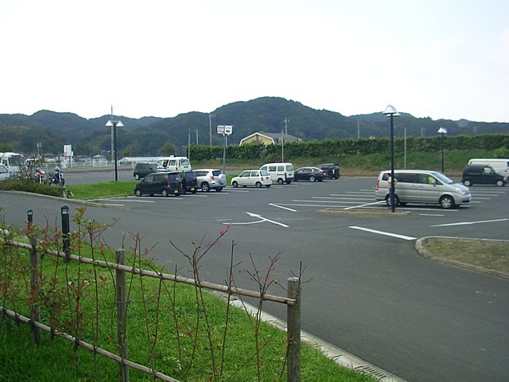 駐車場の周辺は緑が多く雰囲気は落ち着いている。大型車用駐車場の奥がP泊向きの普通車用。