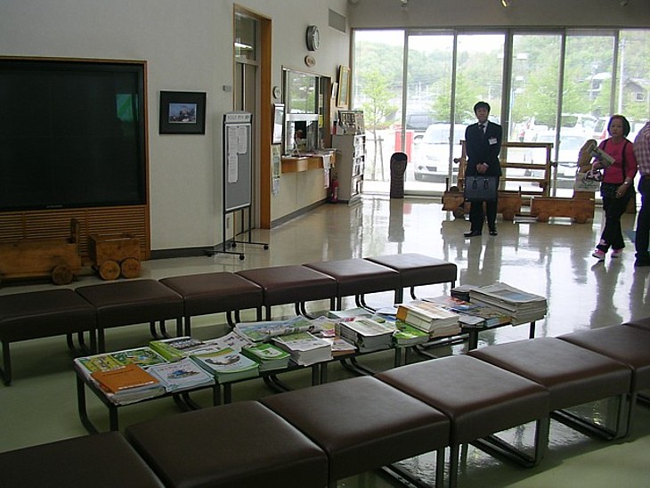 情報館事務所前の休憩コーナーと大型ディスプレイ。特に表示はないが飲食は禁止と思う。