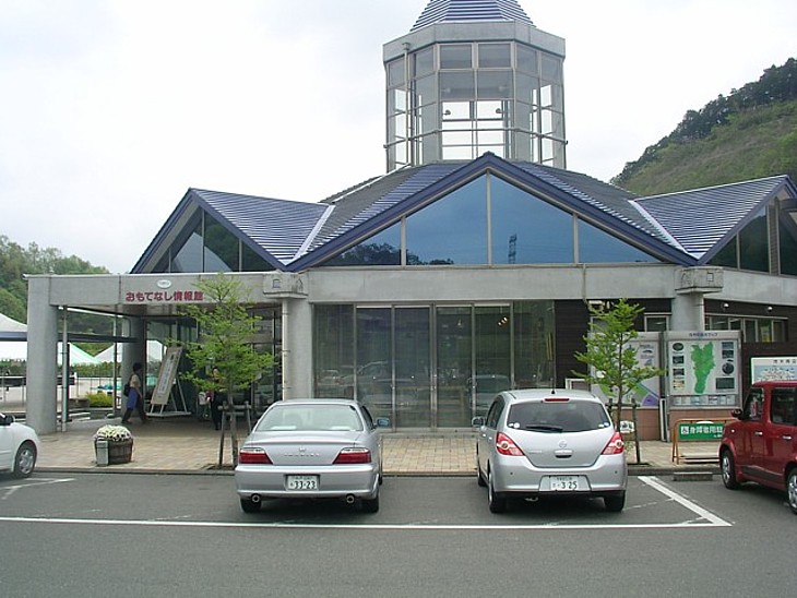 「おもてなし情報館」。道の駅の中枢施設で展示や観光案内と広い休憩コーナーになっている。
