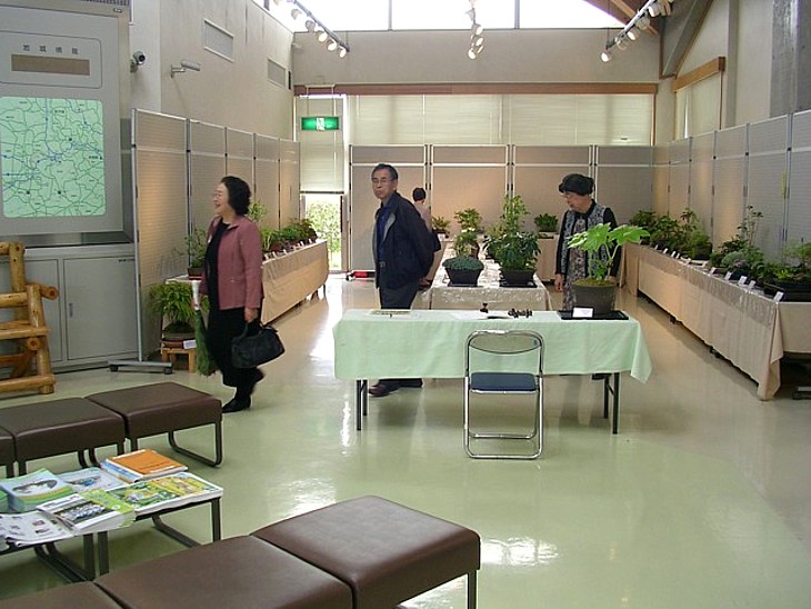 管理事務所左の一角で盆栽展示会を開いていた。スペースが埋め切れない時の窮余の一策か。