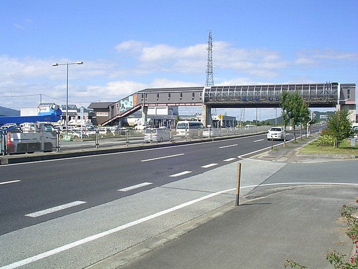 上り側駐車場の入口部分から駅舎を。下り側出入口は国道と側道に各一ヶ所、上り側は国道に面して二ヶ所。