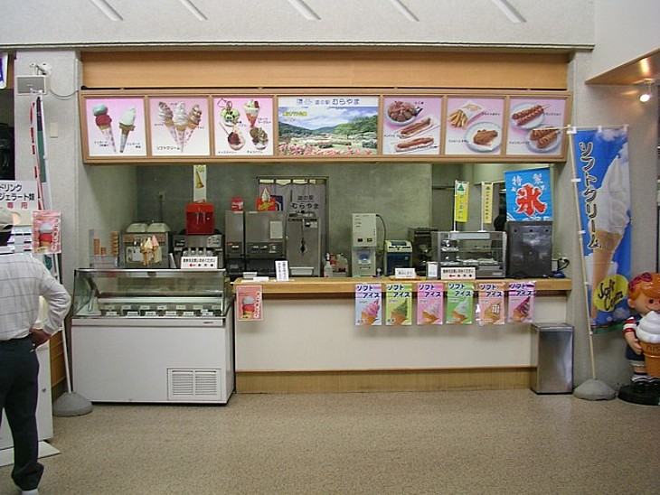 食事処手前の軽食カウンター。人気のバラジェラートは一色盛り300円と二色盛り350円、先に食券を購入する。