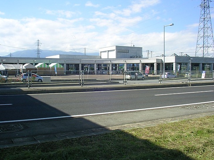 上り側駐車場から、国道越しに食事処と軽食コーナー方向を撮影。季節によってテント販売やテラス席に利用。