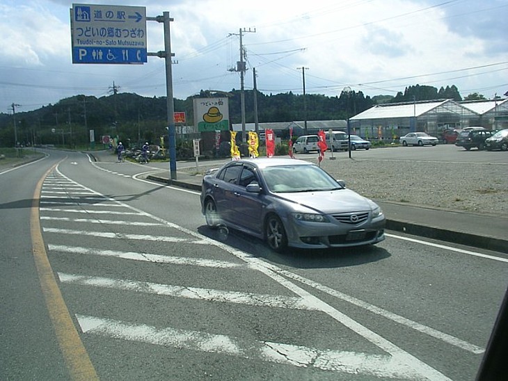 コンビニ前から道の駅の進入路を。道路沿いは砂利敷きの更地で、将来の道路用地かも知れない。
