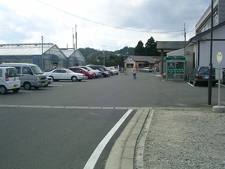 敷地右側に駅舎、左側に付属の温室が2棟、奥にラーメン店。駅の右と温室横にも駐車場がある。