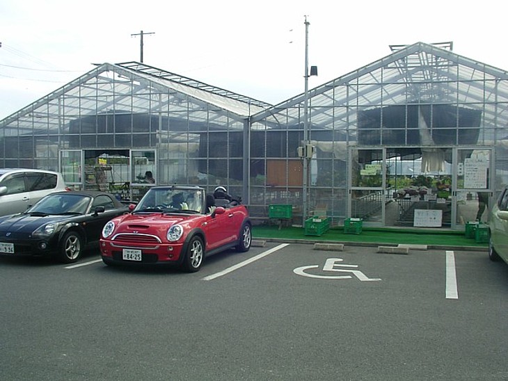 広い温室は鉢花と野菜苗の栽培と直販も行っている。取り扱い品はD2と重複し、産直の割に高め。