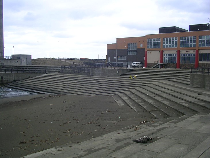 駅舎入口は北側の名立漁港横、これは裏手南側。石段下にある砂浜は舟だまりだろうか。