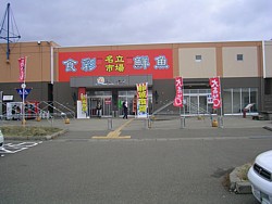中: 派手な色使いの入口部分にはスーパーマーケットっぽい雰囲気がある。休日には数張りのテント販売が駅前を埋めて賑わいを見せる。