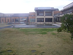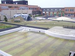 中: 同じ中庭のシンボルガーデンを温泉施設側から撮影した。道の駅はシンボルガーデンを囲む回廊の形に建っている。魚売り場は北の風除室側、