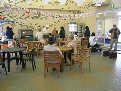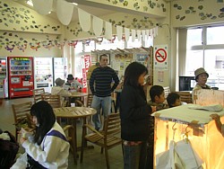 左: 風除室から店内に入るとすぐに広い休憩室。幼児の乗り物があったりタコ焼きを売っていたりで騒々しいがテーブルの数が多いのは有難い。