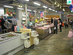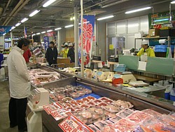 ● 10〜18時(夏は19時)・食堂と同じく第2水曜休、名立漁港直送の鮮魚など海産物が実に豊富で市場の雰囲気、値段も安い。