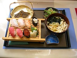 中: 限定昼食セット@ 寿司+わかめの入ってるうどん+何か判らない干物2片+サラダ=1000円 まぁこんなもんかなぁ。
