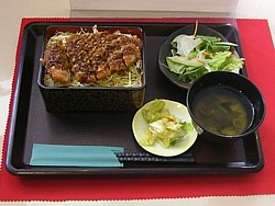 右: 限定昼食セットA カツ重+わかめの味噌汁+サラダ+お新香=1000円 これは限定にする価値なし、と見た!