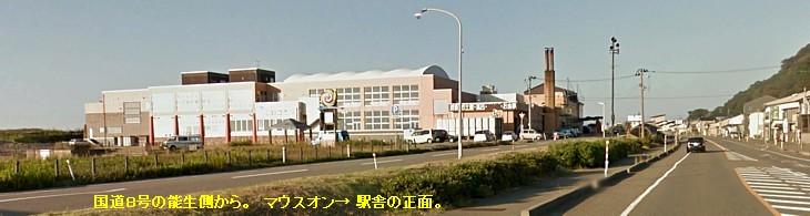 中&右: 駅舎の入口は北側の名立小泊漁港横にある。南側の石段下にある砂浜は舟だまりだろうか。少し殺風景な雰囲気がある。駅舎も新しく