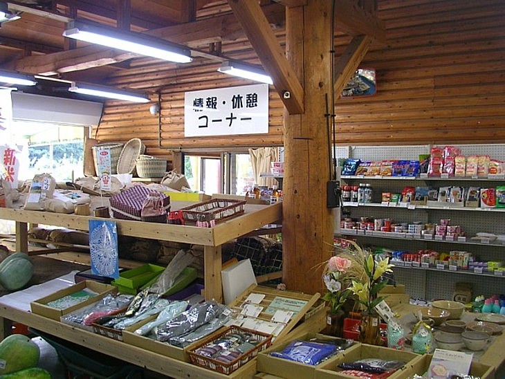 近くに店舗がないためか食品や雑貨を取り扱っている。壁際にある引き戸の向う側が情報&休憩室。