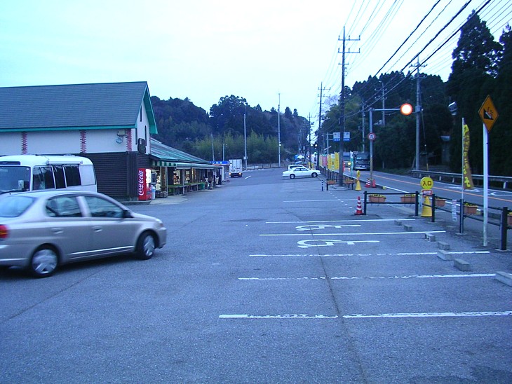 トイレ前から駐車場の全景を撮影。敷地は県道沿いに長く、駅舎の裏側は加工施設が建っている。