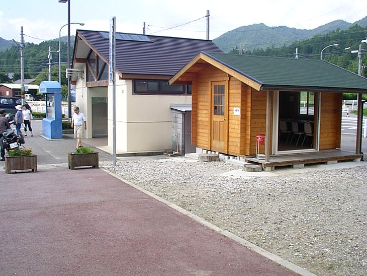 小さな駅だがカラー舗装のアプローチにはベンチを置き、駐車スペースを駅舎から離して雰囲気も大きく改善。