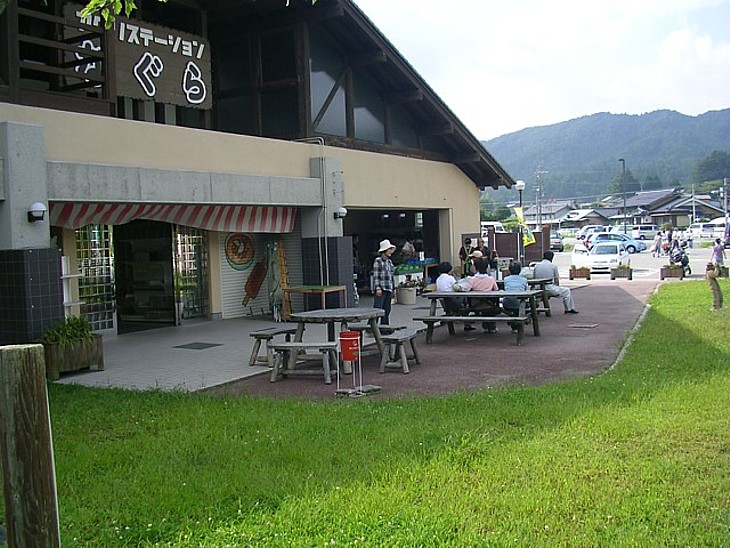 駅舎と国道の間の芝生には数基のテーブル類。持参の弁当を使うも良し、左手の食堂で注文するも良し。