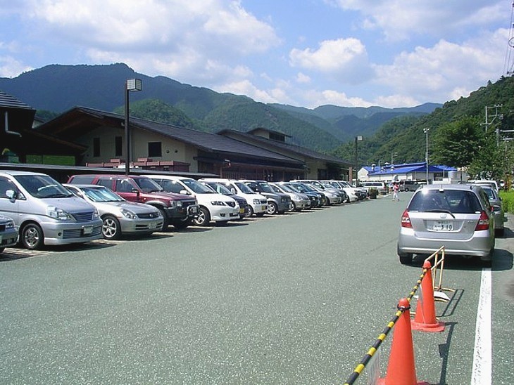 サイン塔の下から温泉棟前の駐車スペースを撮影。ウィークデーの14時なのだが、この日もほとんど満車。