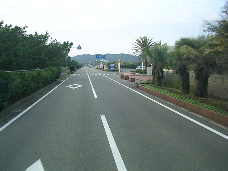 最西端の州崎に向かうフラワーライン。左は防風林、右に国民宿舎「いこいの村たてやま」が隣接する。